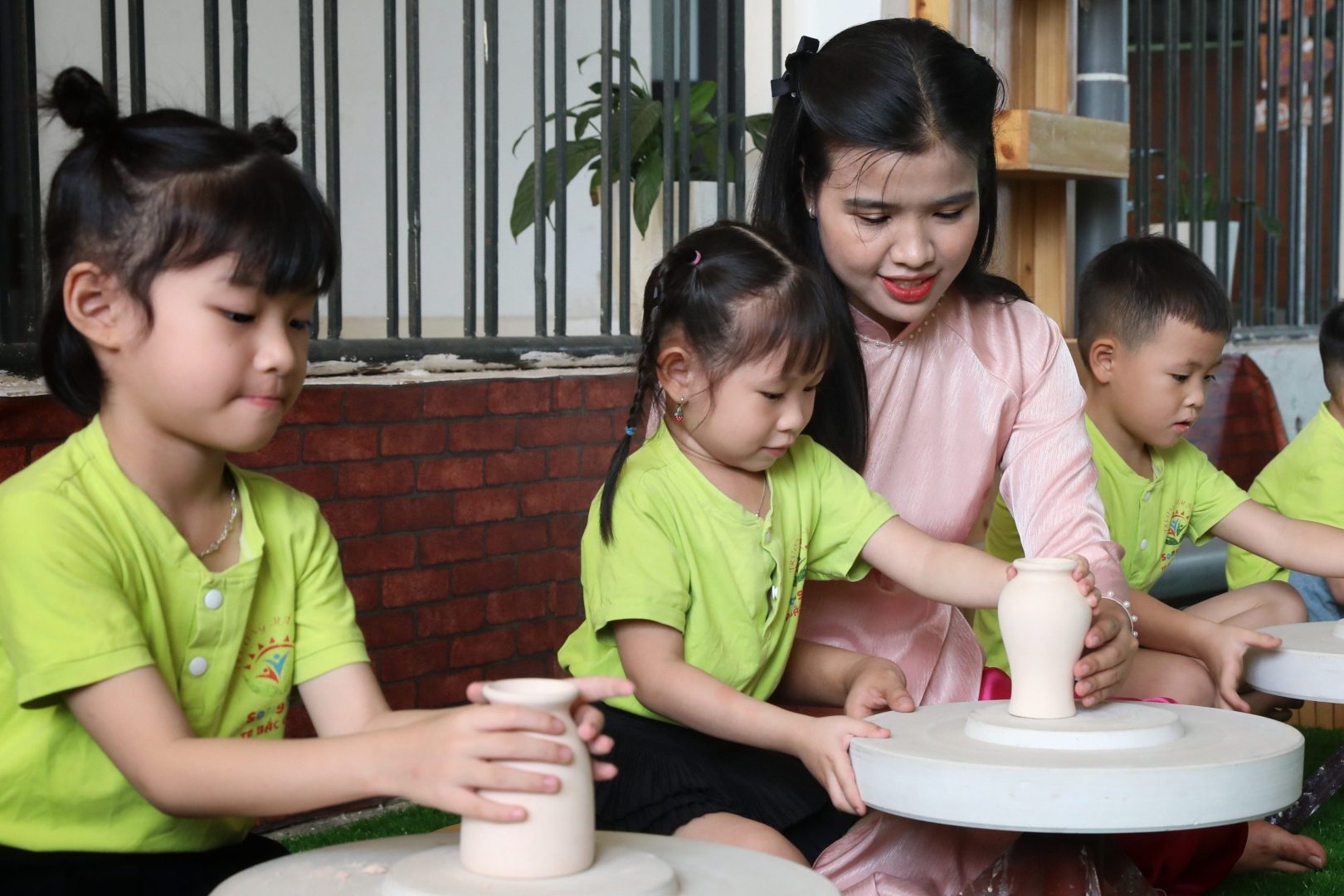 Alunos da pré-escola na província de Bac Giang aproveitam a experiência de fazer cerâmica. (Fonte: VNA)