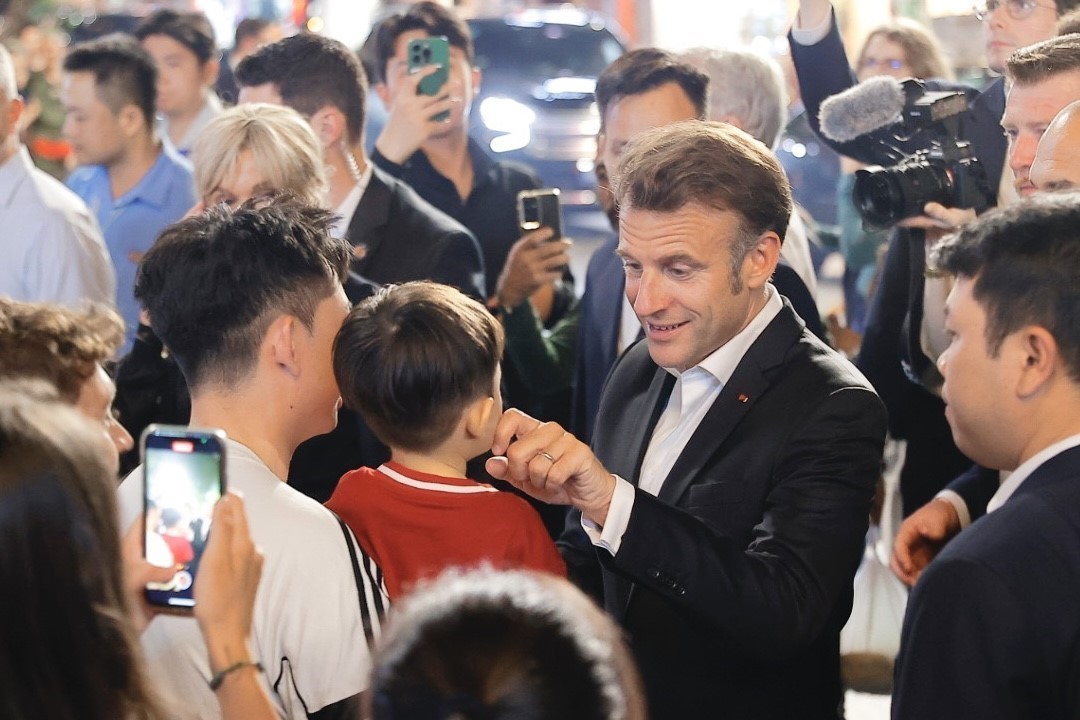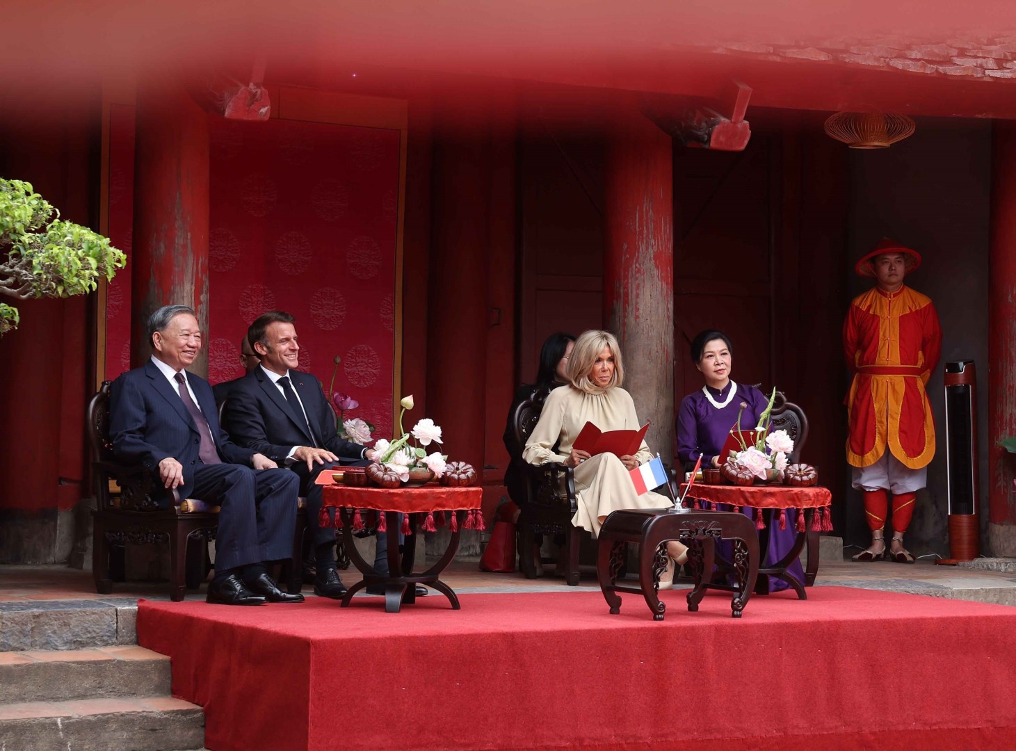 A França é um dos 16 países isentos da exigência de visto para entrar no Vietnã a partir de 1º de março de 2025. Na foto: o presidente francês Emmanuel Macron e sua esposa visitam o Templo da Literatura e passeiam pelo Bairro Antigo de Hanói durante sua visita de estado ao Vietnã de 25 a 27 de maio de 2025. (Fonte: VNA )