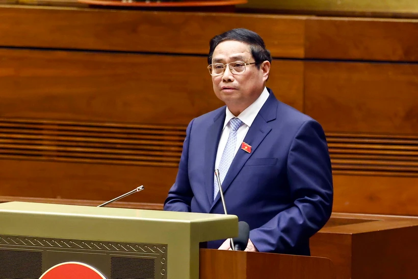 O primeiro-ministro Pham Minh Chinh descreve a direção da energia nuclear na Asamblea Nacional. (Foto: VNA)